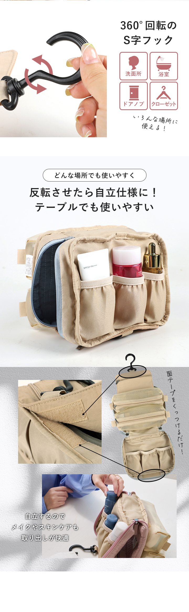 収納は万全!360度回転する大きめのS字フック付きで
