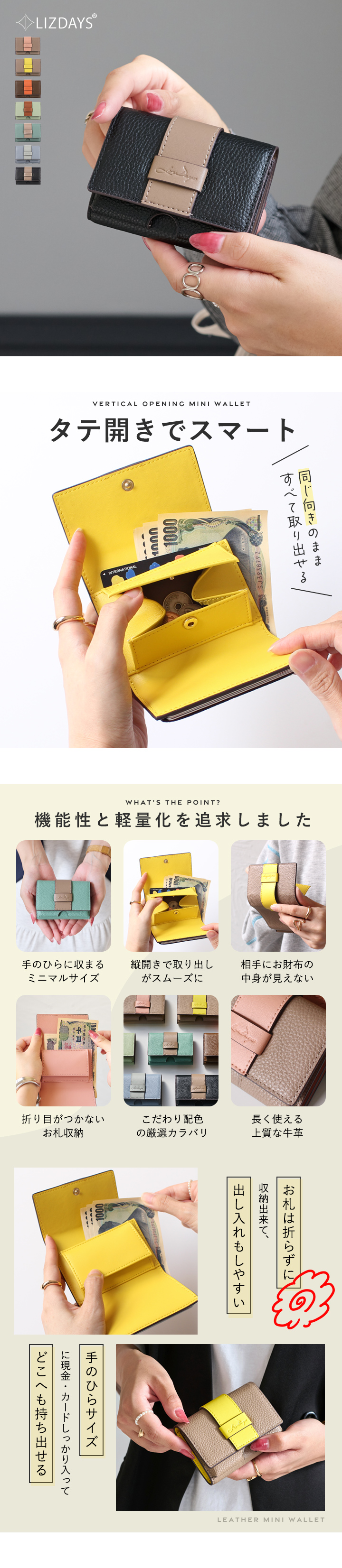 タテに開く、すっきりシンプル設計のお財布。