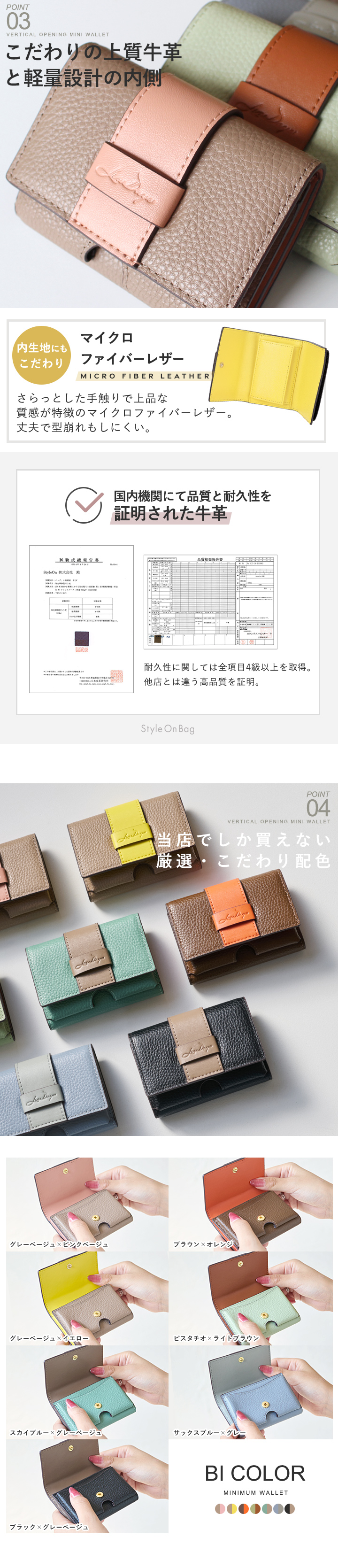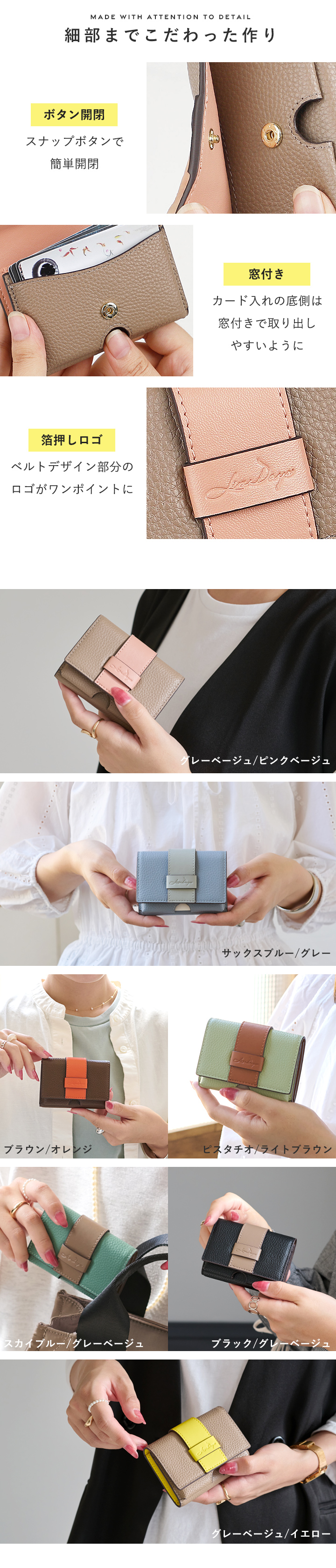 色展開グレーベージュ/ピンクベージュ、グレーベージュ/イエロー、ブラウン/オレンジ、ピスタチオ/ライトブラウン、スカイブルー/グレーベージュ、サックスブルー/グレー、ブラック/グレーベージュ