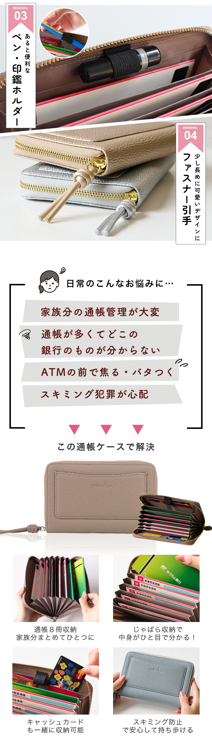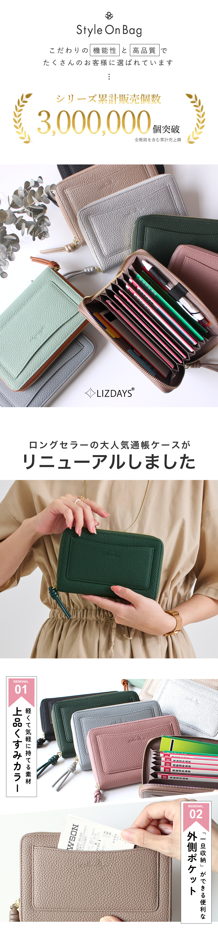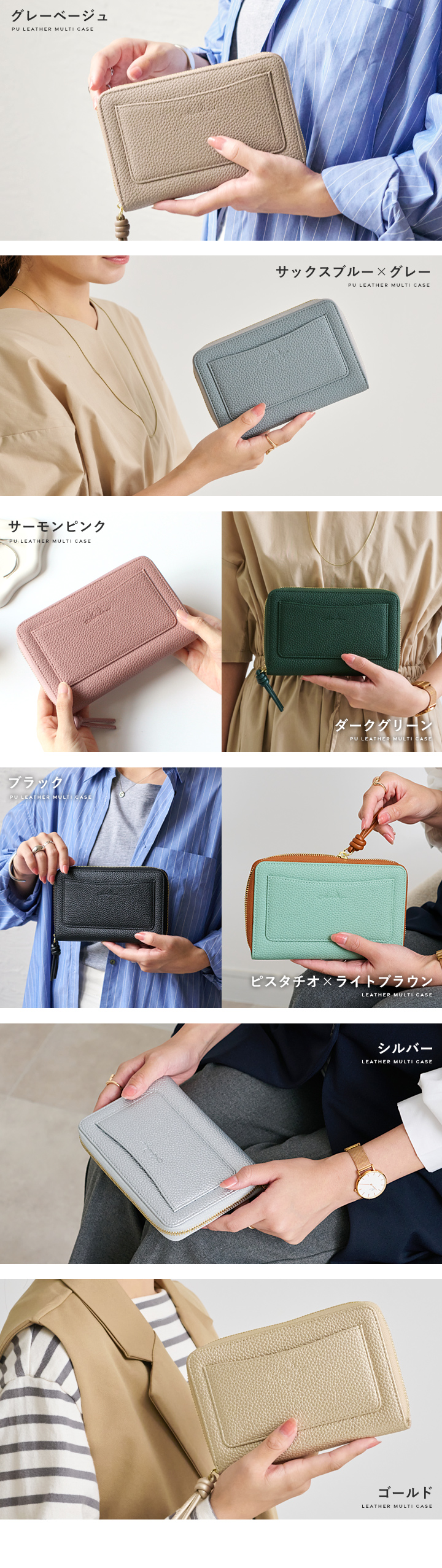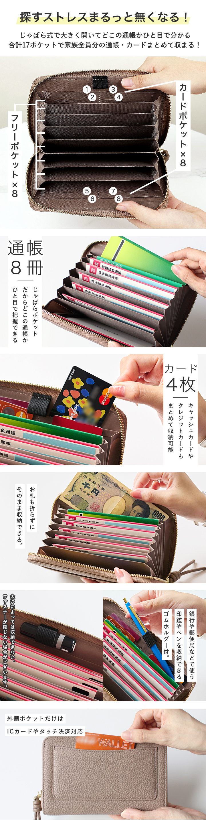 カード入れ×8、フリーポケット×8、外側フリーポケット×1