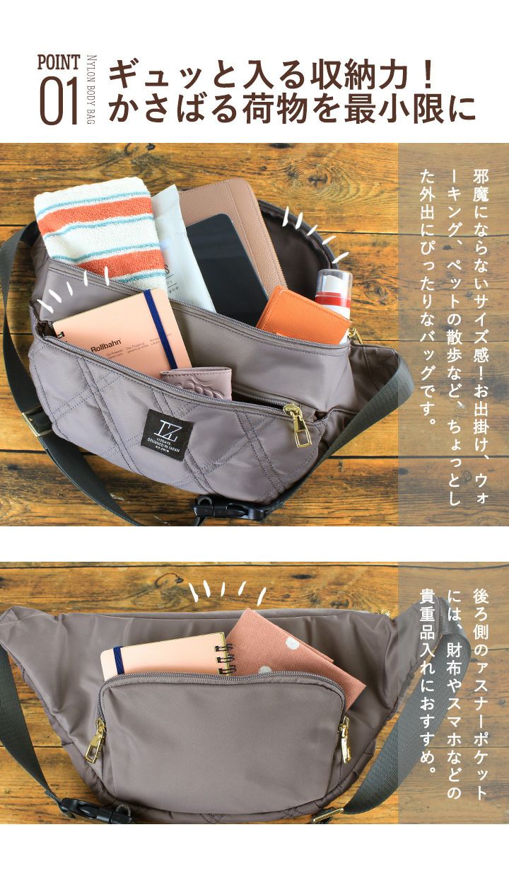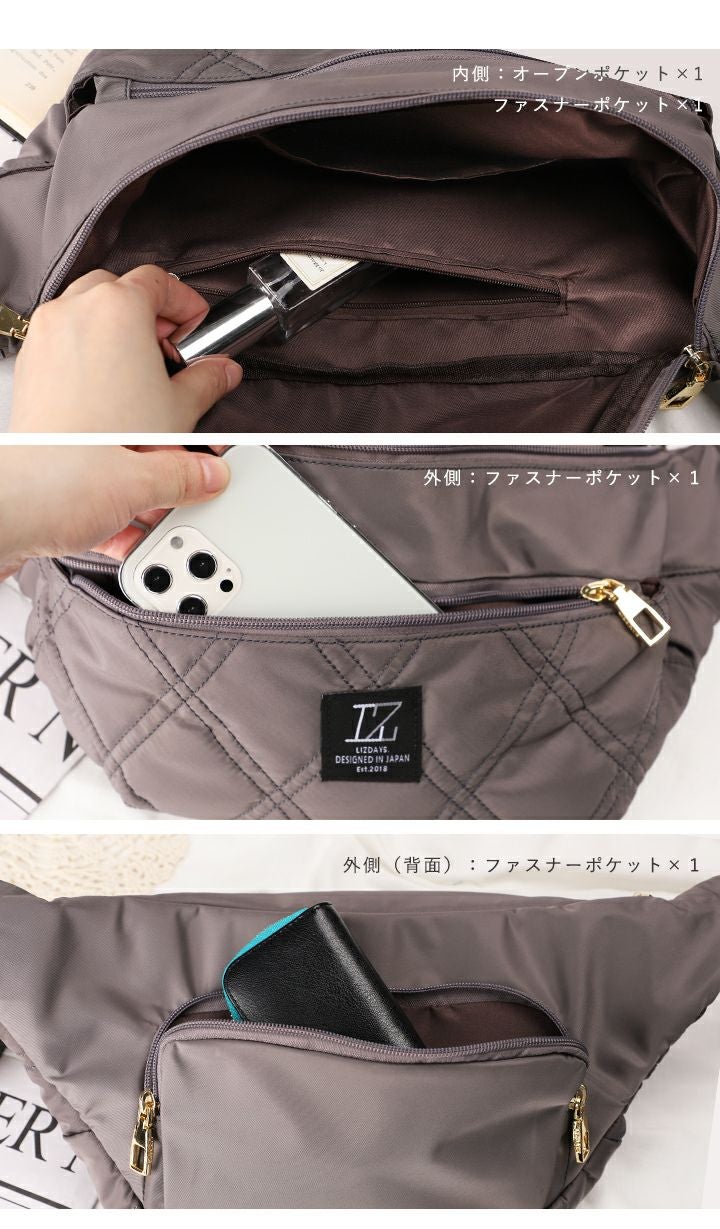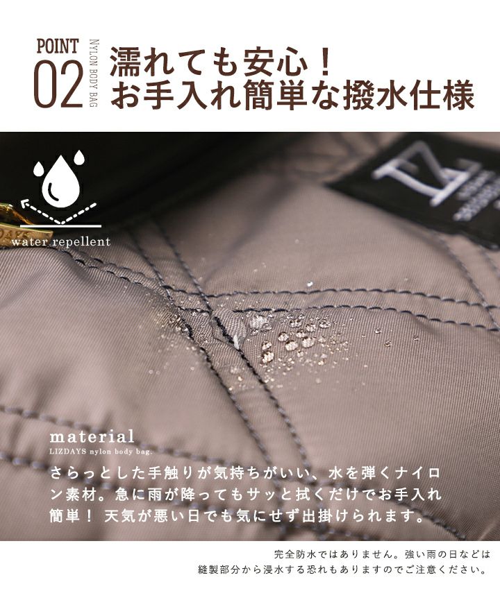 他の画像を見る 肩にかければ両手が自由に使えるボディバッグ。大人っぽいカラーとおしゃれなキルティングデザインに、嬉しい撥水機能付きで雨の日でも安心。 【送料無料】 LIZDAYS リズデイズ ボディバッグ 当店特別価格 ¥ 3,520 税込 会員特別価格 ¥ 3,520 税込 在庫切れ カートに入れる お気に入りに登録する